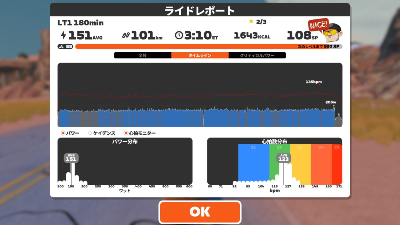残り10分くらい、疲労はあるけどここからSST挑戦できますよくらいのパワーを残して終わり。ついでに100km完了。