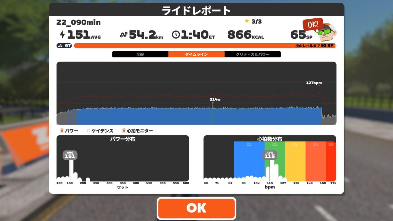 今日のZ2は…ダメですね…。昨日と同じで心拍は低め、パワーも低め。