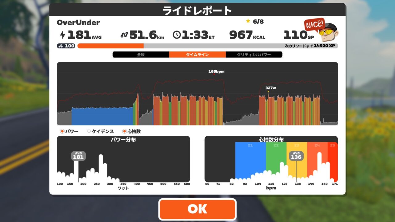 オーバーの設定+13wがやはり高く感じていて乳酸が想像以上に出てしまいアンダーで回収しきれなかったと予想。(実際はアンダーが高すぎた可能性)